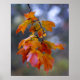 A close up look at some red and orange maple tree leaves with a blurred background.