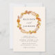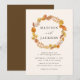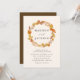 Elegant and rustic fall wedding invitations featuring a wreath of warm autumn leaves surrounding your names with your wedding details displayed below. The reverse side of the invite features a contrasting dark brown background colour.