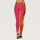 A pair of legs wearing leggings with a red background and red and orange leaves, and black and white sneakers.