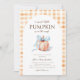 Delight your guests with this charming fall baby shower invitation, perfect for celebrating a little one arriving this autumn. Featuring a soft watercolor pumpkin wrapped in a baby blue bow and set against a cosy orange gingham background, this invite captures the heart of the season. Whether you're planning a Halloween-themed shower or a rustic autumn gathering, this design adds just the right touch of cuteness and elegance. It’s a fall favourite that your guests will absolutely adore!