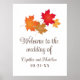 Greet your guests with this warm and inviting wedding welcome sign featuring a trio of vibrant red, orange, and gold maple leaves above elegant script text. The clean white background lets the colorful fall foliage and brown typography shine. Customize with the couple's names and date for a beautiful seasonal ceremony entrance display.
