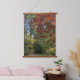 Decorate a living space with this vertical, hanging wall tapestry with wooden tops that features the photographic image of a forest path with colorful shades of maple tree leaves, primarily orange. A lovely, botanical image!