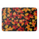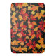 Autumn Midnight, display a vibrant pattern of autumn leaves against a black background. The leaves are a mix of bright red, orange, yellow, and gold hues, representing a variety of species like maple, oak and chestnut. `the contrast between the vivid colours of leaves and dark background creates a striking and dramatic effect, emphasising the warm tones and intricate detail of the foliage. smaller leaves, acorns and twigs are scattered throughout, adding depth and texture to the pattern. The overall has design has an energetic and festive feel of a lively autumn night.