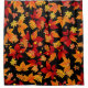 Autumn Midnight, display a vibrant pattern of autumn leaves against a black background. The leaves are a mix of bright red, orange, yellow, and gold hues, representing a variety of species like maple, oak and chestnut. `the contrast between the vivid colours of leaves and dark background creates a striking and dramatic effect, emphasising the warm tones and intricate detail of the foliage. smaller leaves, acorns and twigs are scattered throughout, adding depth and texture to the pattern. The overall has design has an energetic and festive feel of a lively autumn night.