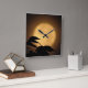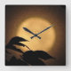 It's autumn, and a luminous golden yellow full moon has risen behind the black silhouettes of leaves blowing in the breeze on this dramatic fine art photography clock. The background is illuminated in tones of orange, gold and brown to create an abstract pattern in an Asian motif.