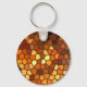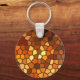 This decorative keychain features a geometric abstract pattern of five sided pentagon shaped mosaic tiles in brilliant autumn colours of red, orange, brown, yellow, gold, blue, grey, black and white.