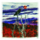 In a night sky with some clouds is a full moon that is red in colour and is rising above a grouping of mountains and hills. A crow is perched on a branch of a dead Birch tree looking out onto the forest of red leafed trees.