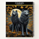 Under a serene night sky, two majestic wolves howl towards a glowing full moon. Surrounded by vibrant autumn leaves, the scene captures a sense of wilderness and tranquillity, evoking the beauty of nature and the mystery of night.