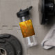 Autumn pattern with falling maple leaves and bokeh water bottle