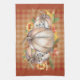 Festive fall design features trio of watercolor illustrated bouquet of light pumpkins with sunflowers and other Autumn foliage, on a background of faded gingham with dark rust border.