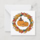 Whimsical autumn scene featuring smiling pumpkins within a vivid leaf wreath. Warm orange, yellow, and earthy greens evoke cozy fall vibes for kids, family apparel, and seasonal decor.