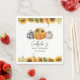This design features three adorable pumpkins in orange, black and white plaid, and leopard print. Sunflowers and pumpkins line edges of the napkin the top and bottom. The expectant mum's name in a handwritten cursive typography is featured along with "Baby Sprinkle" and the date.