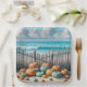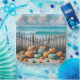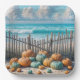 A collection of orange and turquoise pumpkins on a sandy beach framed by a weathered wooden fence