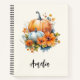Spiral notebook with a fall themed image. Orange and white pumpkins surrounded by fall leaves and orange flowers.