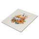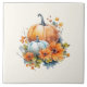 Ceramic tile with a fall themed image. Orange and white pumpkins surrounded by fall leaves and orange flowers.