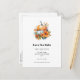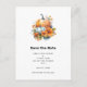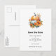 Save the date postcard with a fall themed image. Orange and white pumpkins surrounded by fall leaves and orange flowers.