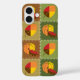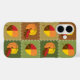 Four squares are decorated with leaves and pumpkins in fall tones of red, orange, yellow, and brown. White stitching adds a decorative touch, giving the repeating pattern the appearance of a quilt, creating a perfectly cosy feeling for autumn.