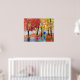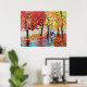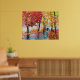 A woman with a blue umbrella walks through the Autumn rain in this painting. Vibrant red and orange were used in this scene using oil paint on canvas.