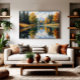 A calm river mirrors the vibrant autumn colours, framed by golden trees and distant mountains. This artwork brings harmony, serenity, and natural beauty to any space — perfect for those seeking peace and inspiration through decor.