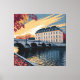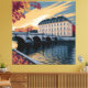 This stylized illustration captures a serene European riverside scene framed by warm autumn foliage and classic architecture. The balanced composition highlights a grand riverside building, an elegant stone bridge, and rich reflections across calm water. With a refined poster-style aesthetic, simplified shapes, and a striking seasonal color palette, this artwork delivers a timeless, atmospheric mood perfect for lovers of travel-inspired cityscapes, architecture, and fall-themed visual storytelling.