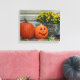A pumpkin, jack-o-lantern and yellow mums are perfect for an autumn display.