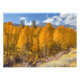 A vibrant autumn scene unfolds with a dense forest of aspen trees, their leaves ablaze in brilliant shades of gold. The trees stand tall and slender, their branches reaching towards a clear blue sky dotted with fluffy white clouds. The majestic Sierra Mountains range rises in the background, its peaks partially obscured by the golden canopy.