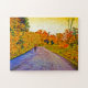 A woman takes a walk down a road lined with trees ablaze with fall foliage on this beautiful jigsaw puzzle.