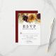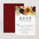 Rustic fall flowers - yellow sunflowers, burgundy flowers and ivory white hydrangeas top of this pretty floral RSVP card. The back is dark burgundy red. This is part of the Sunflower and Burgundy Wedding collection that contains many coordinating items that you can use to create an elegant and unique wedding stationery package.