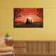 Two dogs and cat silhouette watching the sunset on an autumn evening. Bright, vivid orange fall colours. With two trees on both sides with falling autumn leaves and birds flying towards the sunset. Fall scenery Original Acrylic Painting Art done by Donna Leger for Irony Designs. All Rights Reserved.