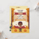 Surrounding him, the invitation bursts with classic Thanksgiving elements that inspire a festive atmosphere. A cute turkey with wide, colourful feathers adds whimsy and cheer, its playful gaze inviting young guests to join in the fun. Pumpkins, paired with scattered autumn leaves in hues of orange, red, and yellow, create a cosy, fall-themed backdrop that feels as warm as the season itself.