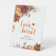 Elevate your autumn-themed celebration with this "Love is Sweet, Please Take a Treat" Pedestal Sign, perfect for adding a touch of rustic elegance to your event. Featuring a warm palette of burnt orange, burgundy, crimson red, terracotta, and brown, this sign complements any autumnal decor. Ideal for weddings, bridal showers, or any fall gathering, it guides guests to your thoughtful favours while enhancing the seasonal atmosphere.