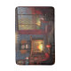 A cosy reading corner on a rainy autumn day. Around the hearth with a blazing fire are cushy red armchairs, with stacks of books and teacakes and a teapot to complete the comfort. Outside a yellow willow and red maple and beech hedge are obscured by the blowing rain, which sprinkles the window where a ginger cat sits looking out.