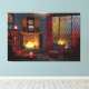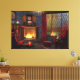 A cosy reading corner on a rainy autumn day. Around the hearth with a blazing fire are cushy red armchairs, with stacks of books and teacakes and a teapot to complete the comfort. Outside a yellow willow and red maple and beech hedge are obscured by the blowing rain, which sprinkles the window where a ginger cat sits looking out.