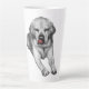 Rich grayscale shading frames a serious face broken by a sudden red tongue—equal parts loyal and mischievous. A playful start to pumpkin-spiced mornings.