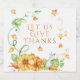 Beautiful Autumn watercolor design features a display of fall gourd pumpkins, green curly vines and Fall leaves. In the centre it says "Let Us Give Thanks".