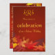 Elegant abstract Autumn Celebration wedding invitation cards with envelopes, decorated with falling leaves and fancy scrolls in warm harvest colours. Illustrations © Teri Francis. Matching postage stamps and greeting cards available in gallery.