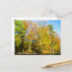 A postcard showcasing a sunlit English forest in full autumn colour beneath clear blue skies.