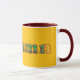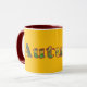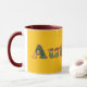 The word Autumn is spelled with cutout letters from a painting I did of colorful autumn leaves. The letters are outlined in a reddish brown color with can coordinate with the handle and inside cup color. The background color of yellow orange, behind the letters, can be customized. The color choice of the inside cup color and handle is selected on the ordering page. Thank you for shopping at CherylsArt on Zazzle.