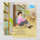 A colourful invitation featuring a woman sitting on the floor in front of a bookcase with a book in hand.