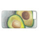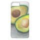 Watercolor painting of a fresh green avocado sliced in half. Grayish and blue mottled background.