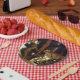AWAY IN A MANGER features a vintage nativity, with a kneeling Mary in a green robe to the right of Baby Jesus in the manger and Joseph to the left of the manger, bathed in the light of the king's star.