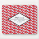 Mousepad with a repeating pattern with 2 red hearts with a white border joined together. A diamond shaped frame layered over top with your text inside. Personalised with a name and text which says: One Awesome Nurse.
