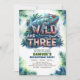 Embark on a birthday expedition like no other with this "Wild and Three" invitation, tailor-made for your little adventurer's leap into the marvellous age of three. The invitation greets guests with earthy, robust typography that echoes the call of the wild. Words "Wild and Three" created from stone, as if uncovered on a jungle trek. The title is surrounded and interwoven with an array of reptiles. A slinky snake, a vibrant frog and a stealthy chameleon blends into the lush jungle foliage. If your birthday plans include the thrill of live animals, where little hearts beat faster at the sight of these amazing creatures, this invitation is your perfect start. It's crafted not just to announce a party, but to transport your guests into a world where the wild romps free and every leaf and vine holds a story. So, let the jungle drums roll and signal the start of a birthday journey that promises to be as wild, wondrous, and full of life as your little boy.