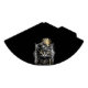 A fierce looking dark gray and black pussy cat wearing a leather hat with steampunk brass on it. A bronze feather tops the cock-eyed hat. This beautiful feline is wearing a golden or amber lensed monocle giving one eye a bronze tone, Around the cats neck hangs a brass trinket of some kind adding to the overall Steampunk attire.