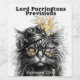 A fierce looking dark gray and black pussy cat wearing a leather hat with steampunk brass on it. A bronze feather tops the cock-eyed hat. This beautiful feline is wearing a golden or amber lensed monocle giving one eye a bronze tone, Around the cats neck hangs a brass trinket of some kind adding to the overall Steampunk attire.