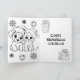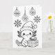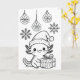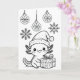 A personalized Christmas card with an axolotl coloring page. Other fun coloring elements too like a puppy and cat and gifts.