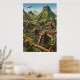 A old Aztec city in the mountain, blue sky and a flying machine in the sky. This is a AI generated art.
