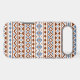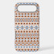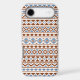 An Aztec style design in a digital and vector pattern with rust/terracotta color and blue detail on a cream background.