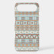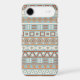 An Aztec influenced style of design in a digital and vector pattern in blue, cream and terracotta colors.
