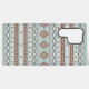 Aztec influenced mixed motif pattern in rust colours and a cream colour detail on a blue background.